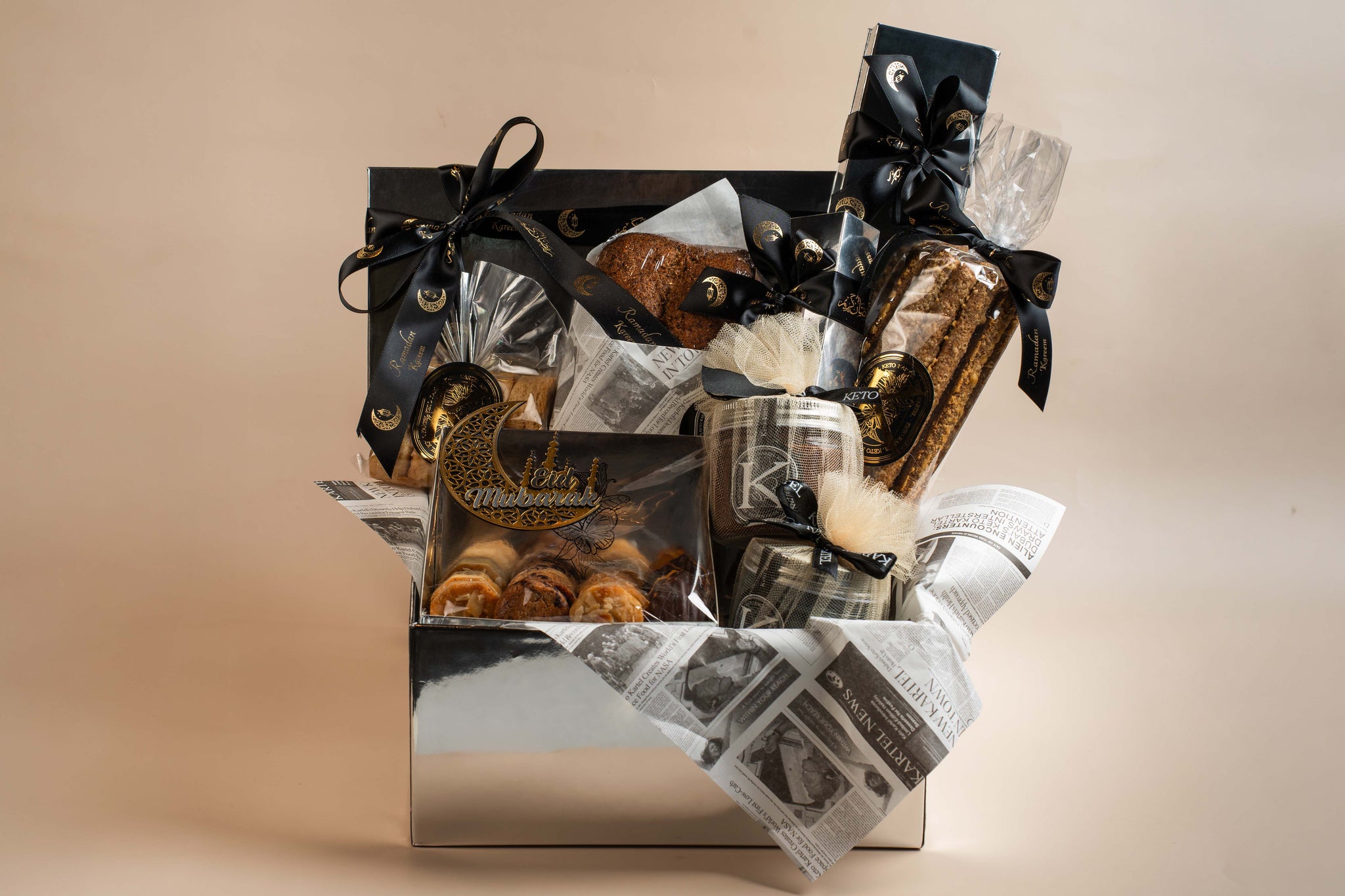 A beautifully curated Ramadan themed hamper featuring a decadent chocolate box, artisanal gluten-free bread, crunchy breadsticks, a curated selection of cookies, and chocolate-covered nuts— a celebration of seasonal delights to sweeten each moment. Perfect for gifting and sure to impress.