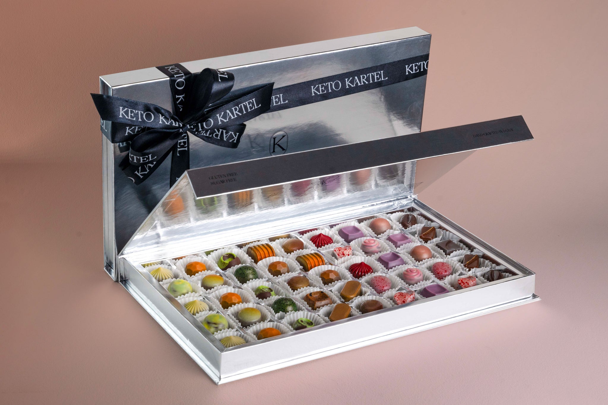 100% Sugar-free and Gluten-free - Total 45 chocolates - 2pcs each & 3pcs assorted - Rich Pistachio, Silken Hazelnut, Toasty Pecan, Zesty Orange, Velvety Vanilla, Cool Mint, Raspberry Creme, Coconut Bliss, Roasted Coffee, Nutty Coconut Trio, Mandarin Rose, Caramel crunch, Raspberry Royal, Hazelnut Praline, Caramel Drizzle, Delicate Chamomile, Exotic Coco-Raspberry, Golden Turmeric, Jasmin Bloom, Chocolate Delight, Salted Caramel. 450gms)